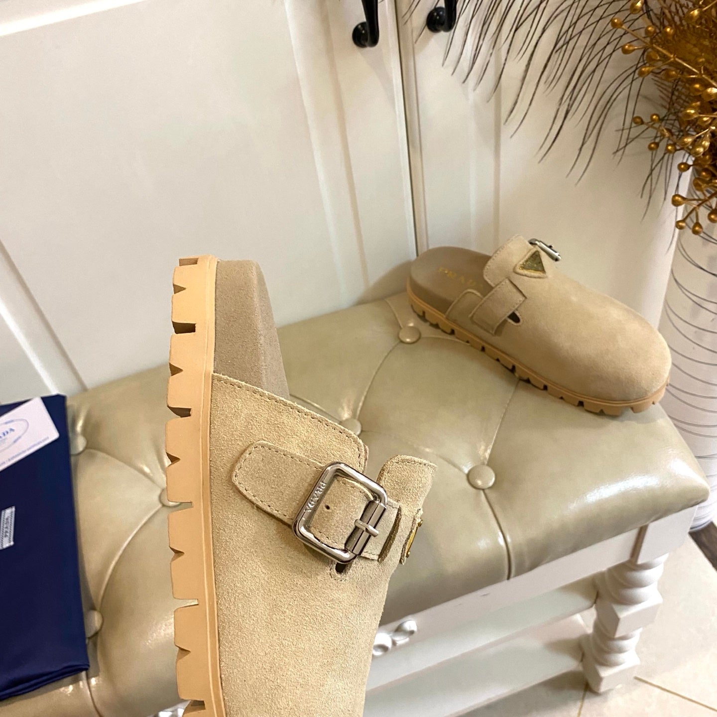 PRADA 26S BUCKLE CLOG SANDALS CHUNKY SOLE IN BEIGE SUEDE