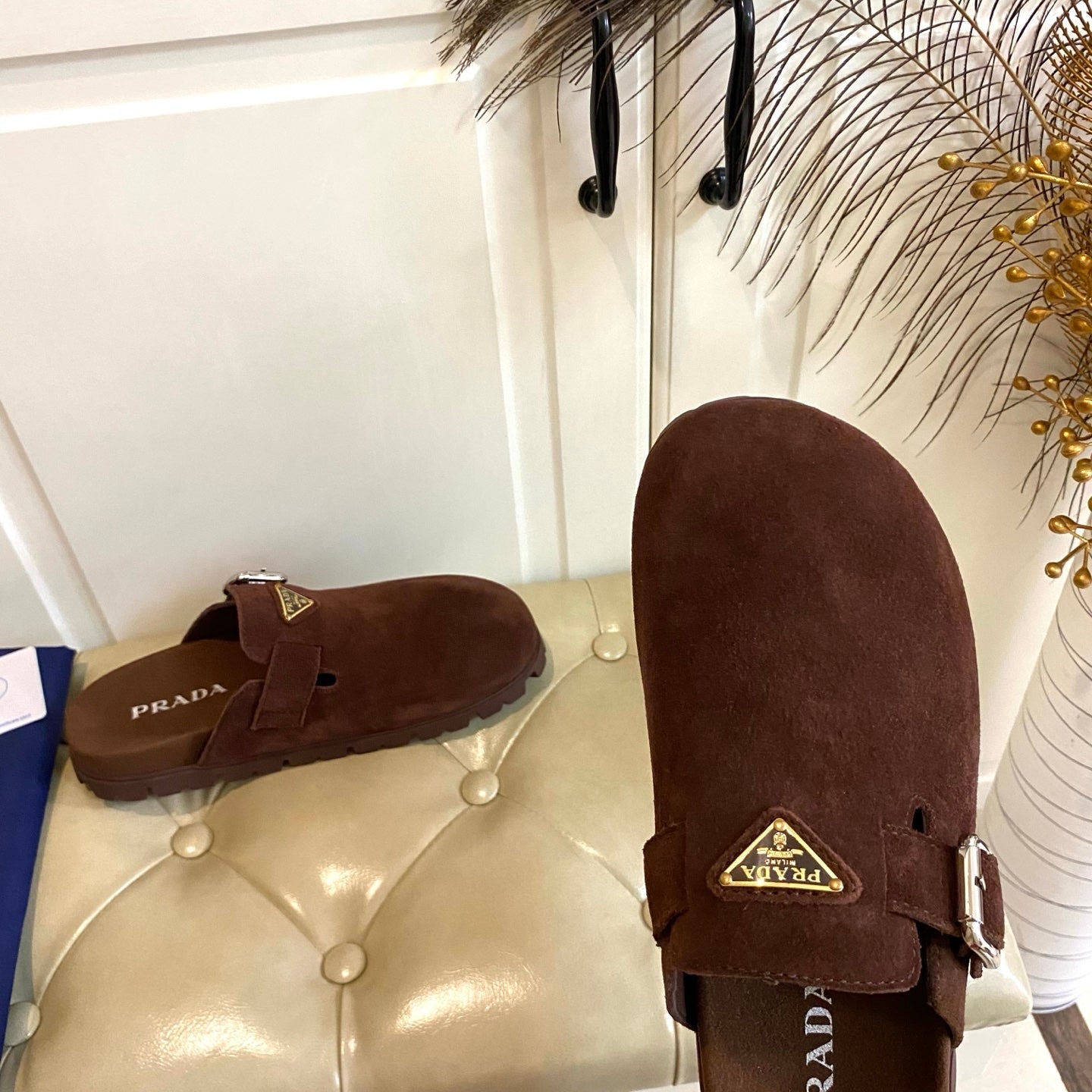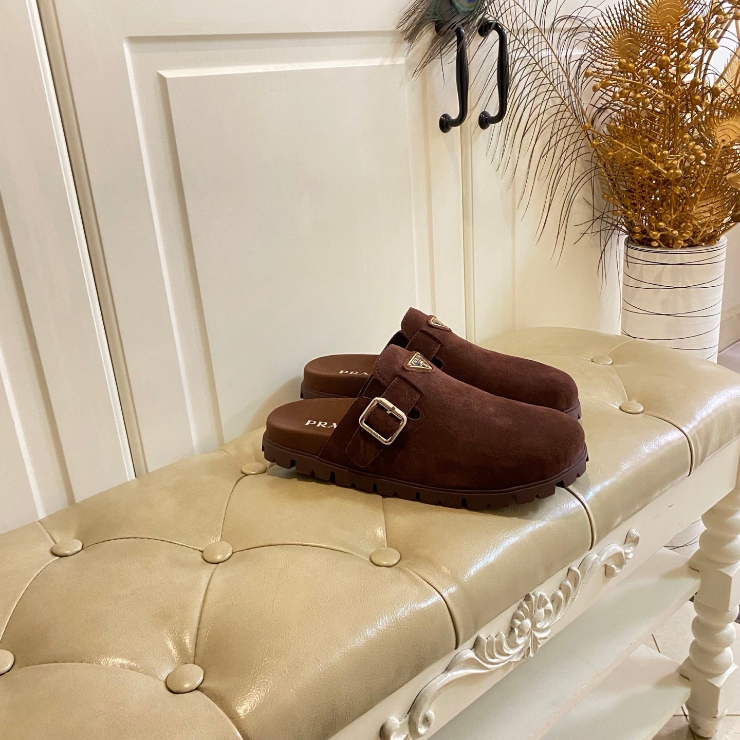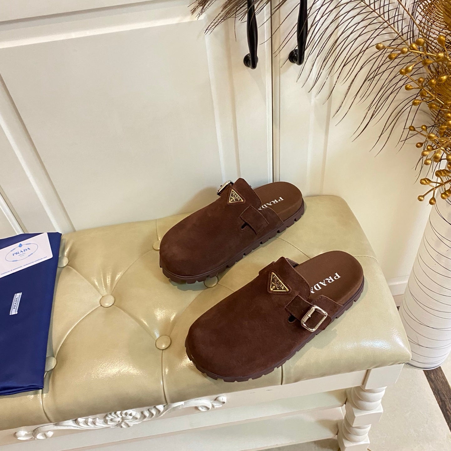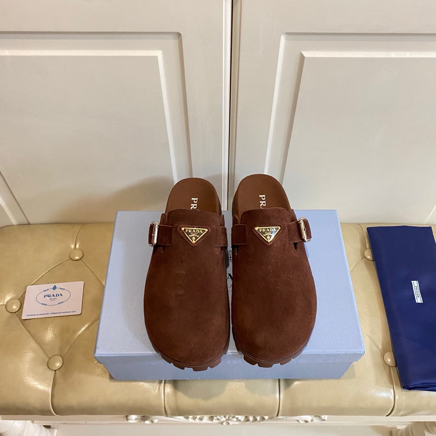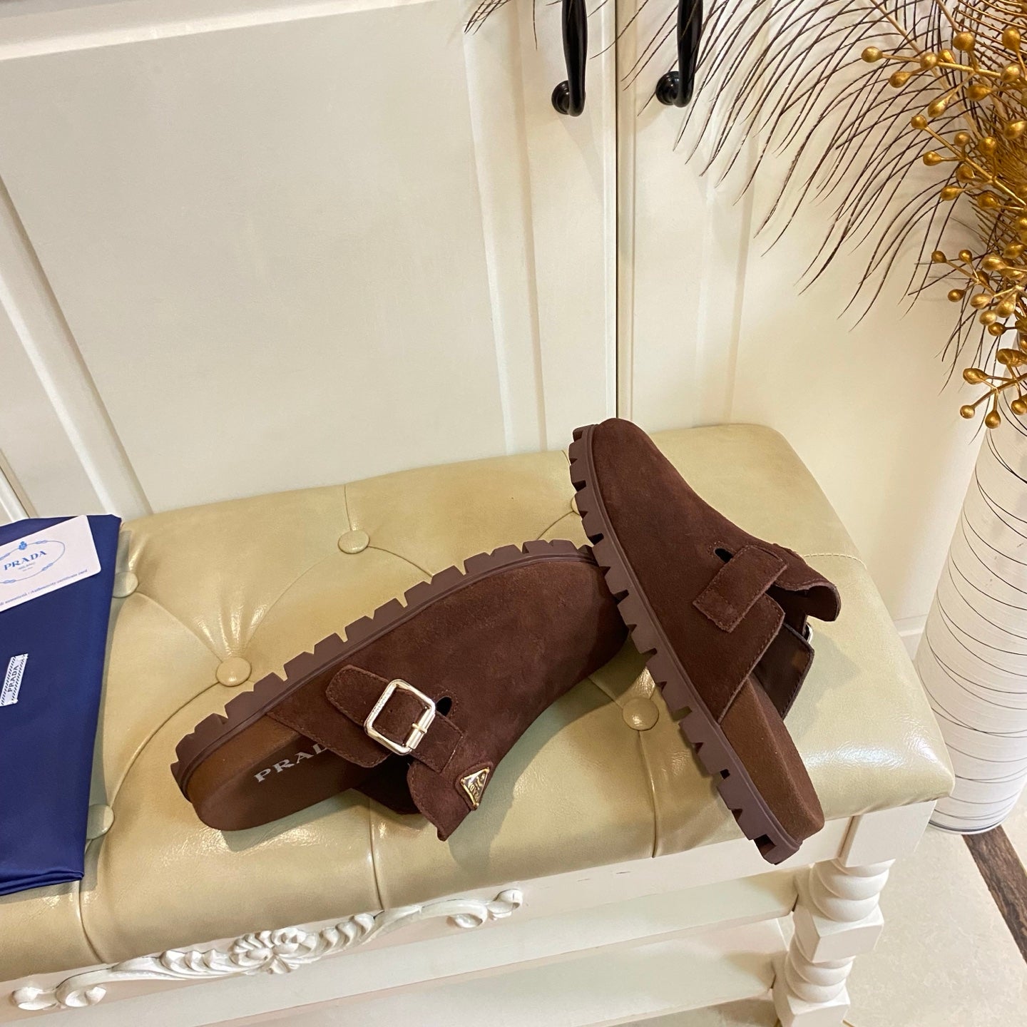 PRADA 26S BUCKLE CLOG SANDALS CHUNKY SOLE IN DARK BROWN SUEDE