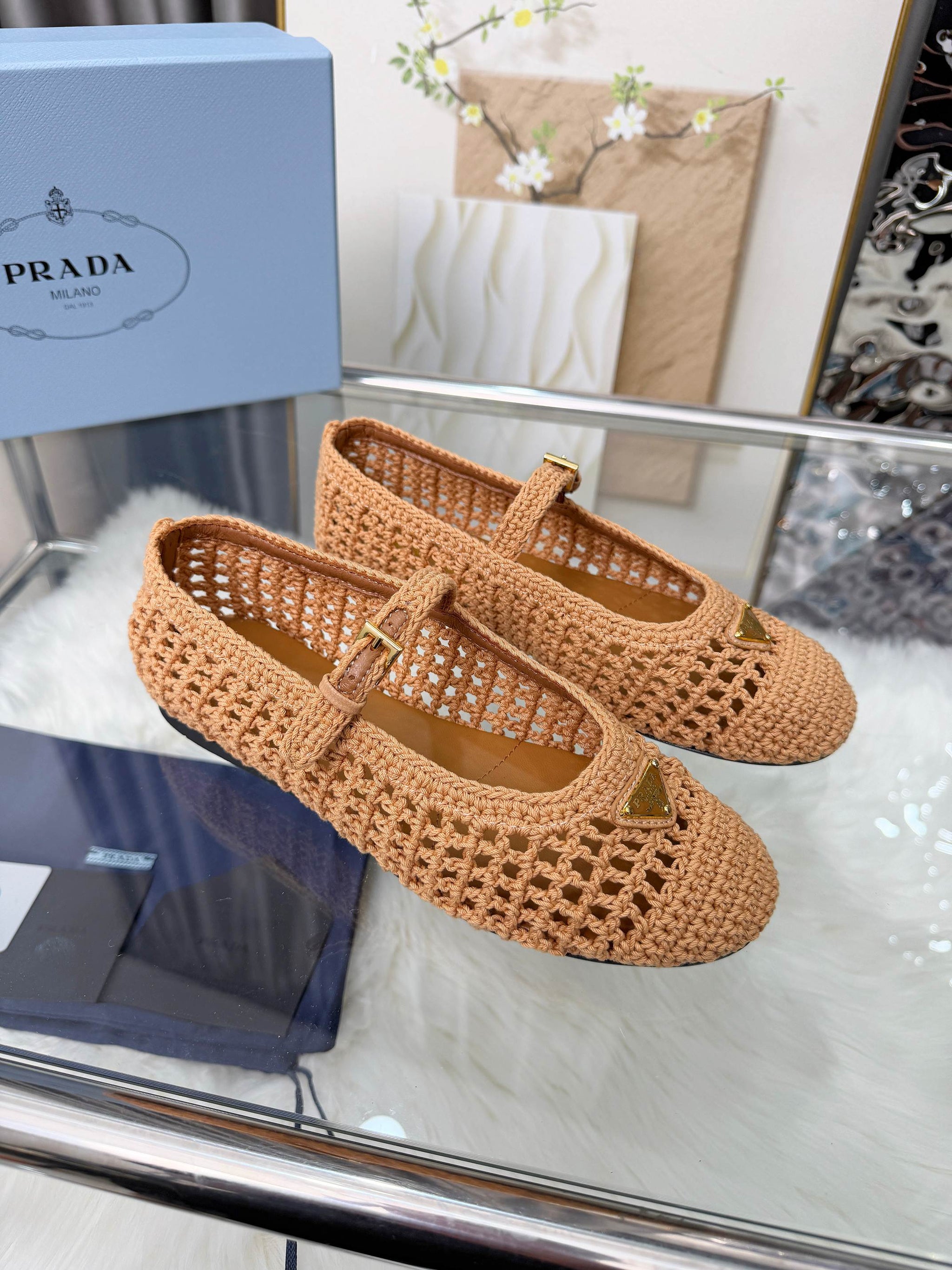 PRADA 26S MARY JANE FLATS IN BROWN WOVEN RAFFIA WITH TRIANGLE LOGO