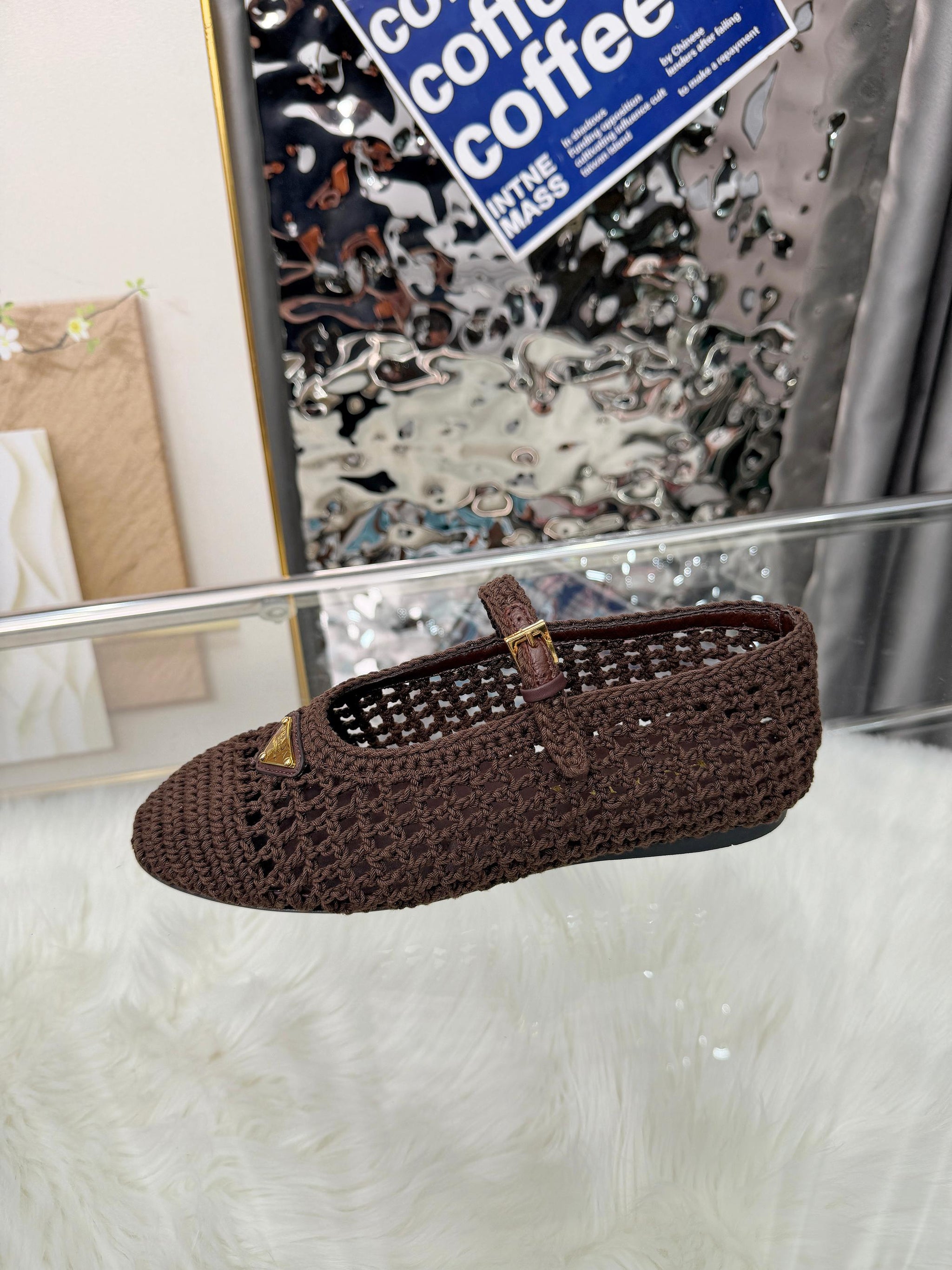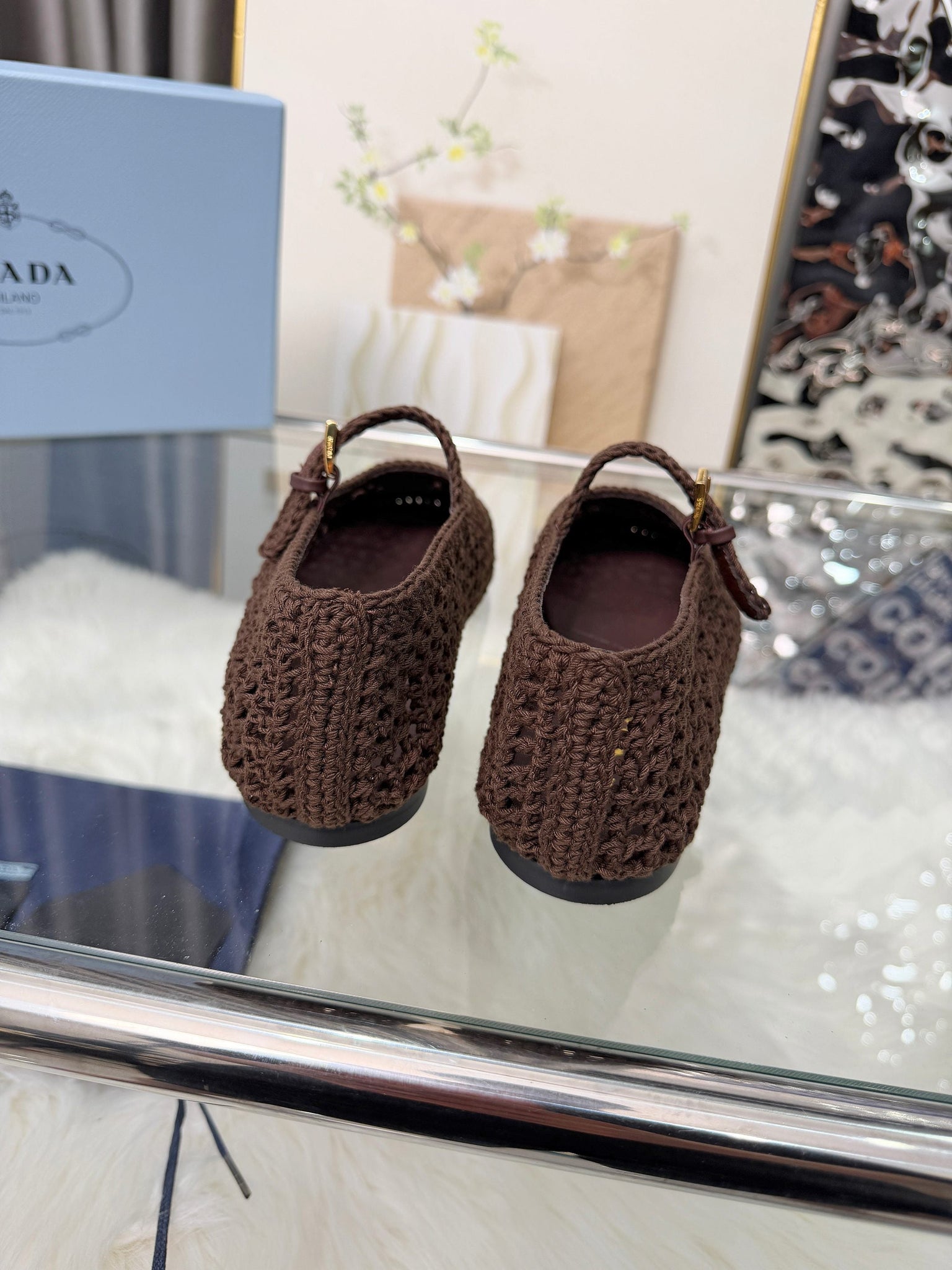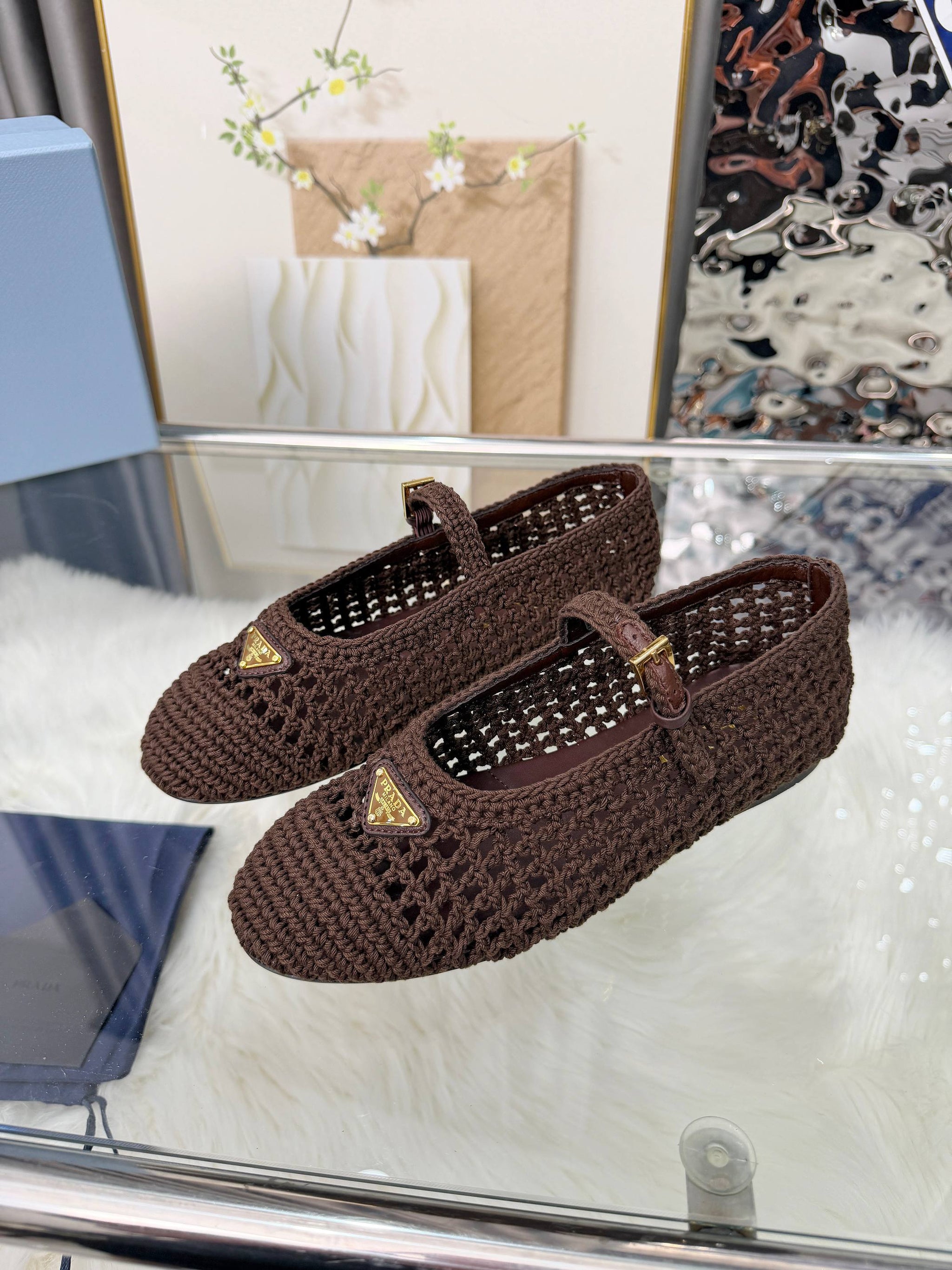 PRADA 26S MARY JANE FLATS IN DARK BROWN WOVEN RAFFIA WITH TRIANGLE LOGO